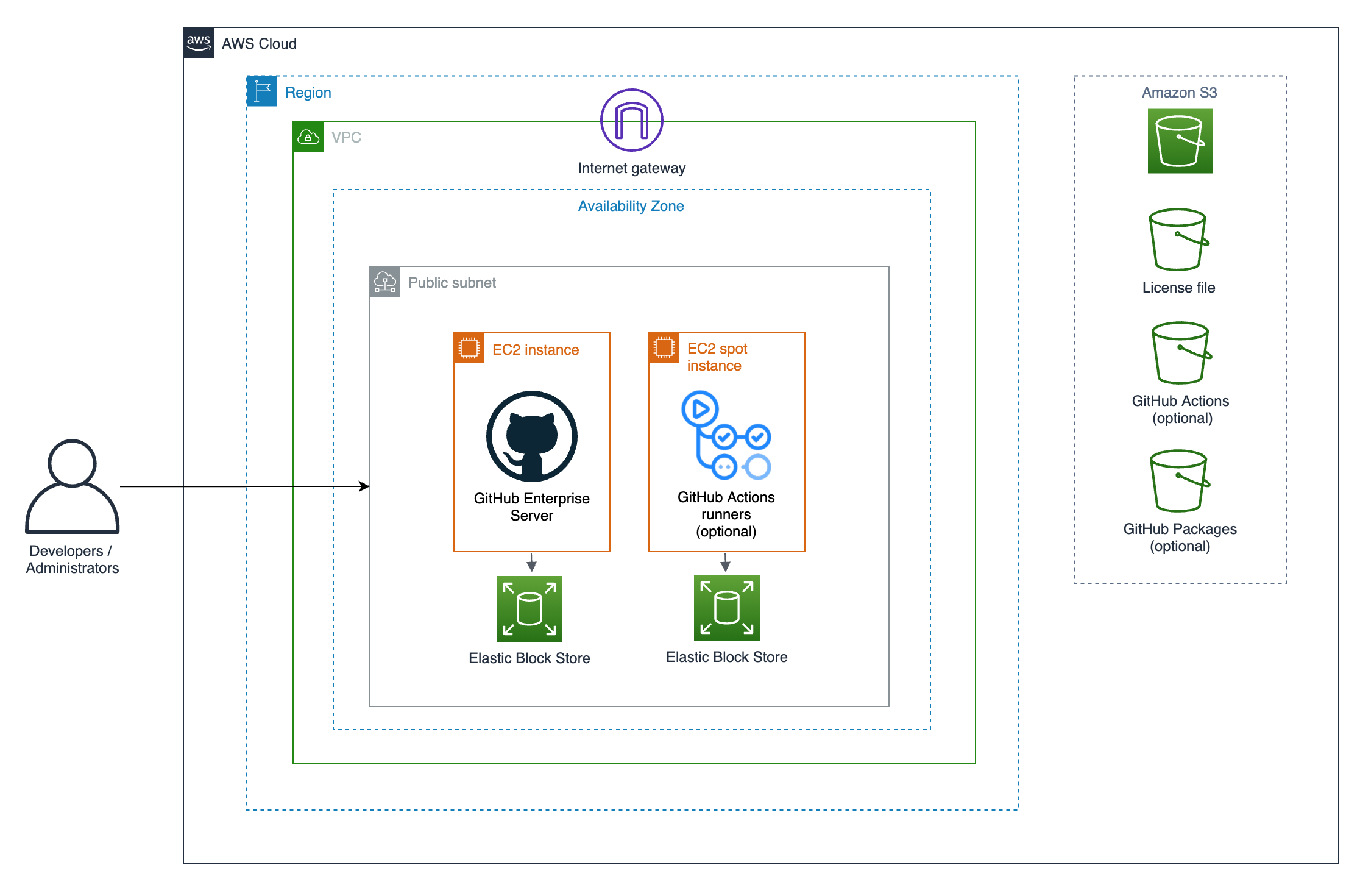 For a diagram that provides an architectural overview, see the "AWS Architecture Diagram for Deploying GitHub Enterprise Server."
